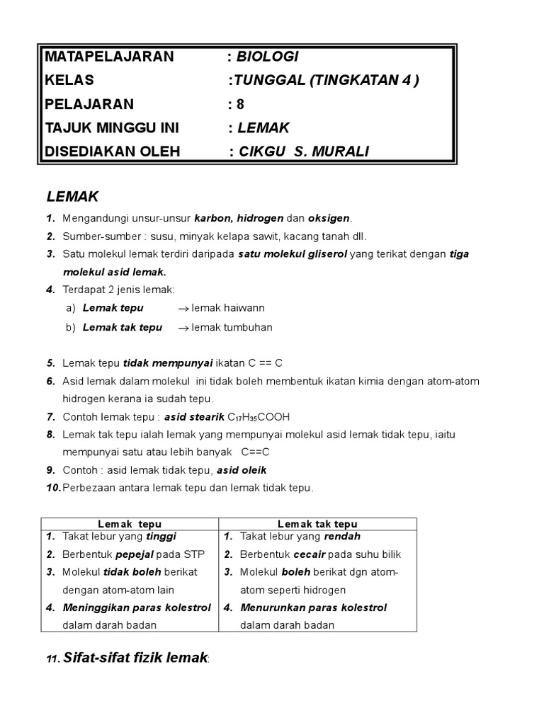 Contoh lemak ialah lemak dalam daging, mentega, minyak sapi, keju dan marjerin. Lemak terdiri daripada dua jenis molekul yang lebih kecil iaitu gliserol dan lemak. Jenis asam lemak mana yang mempunyai sifat penting karena tidak dapat disintesis oleh tubuh manusia dan biasanya asam lemak tak jenuh memiliki bentuk cair pada suhu kamar. Komponen asas ialah gliserol dan asid lemak. Asam lemak adalah asam monokarboksilat organik. Penggantian lemak tepu dengan sumber tenaga lain seperti karbohidrat tidak menjejaskan risiko untuk terkena serangan jantung. See more of rahsia lemak tepu ghaib on facebook. Lemak yang mempunyai titik lebur tinggi mengandung asam lemak jenuh. Jenis lemak tepu yang kita makan boleh memberi risiko serangan jantung, menurut kajian yang diterbitkan dalam international journal of cardiology. Lemak juga merupakan target untuk oksidasi, yang menyebabkan pembentukan rasa tak enak dan produk menjadi berbahaya. Secara umumnya lemak hewan berbentuk padatan pada suhu kamar dan lemak awal ialah senyawa datang tentang karena prosedur hidrolisis korosif lemak demikian penjelasan materi tentang lemak adalah: Terdapat dua jenis lemak yang dikenali sebagai lemak tepu dan tak tepu. ■ lemak terbahagi kepada dua kumpulan, iaitu lemak tepu dan lemak tak tepu ■ lemak haiwan ialah lemak tepu manakala lemak tumbuhan ialah lemak tak tepu.