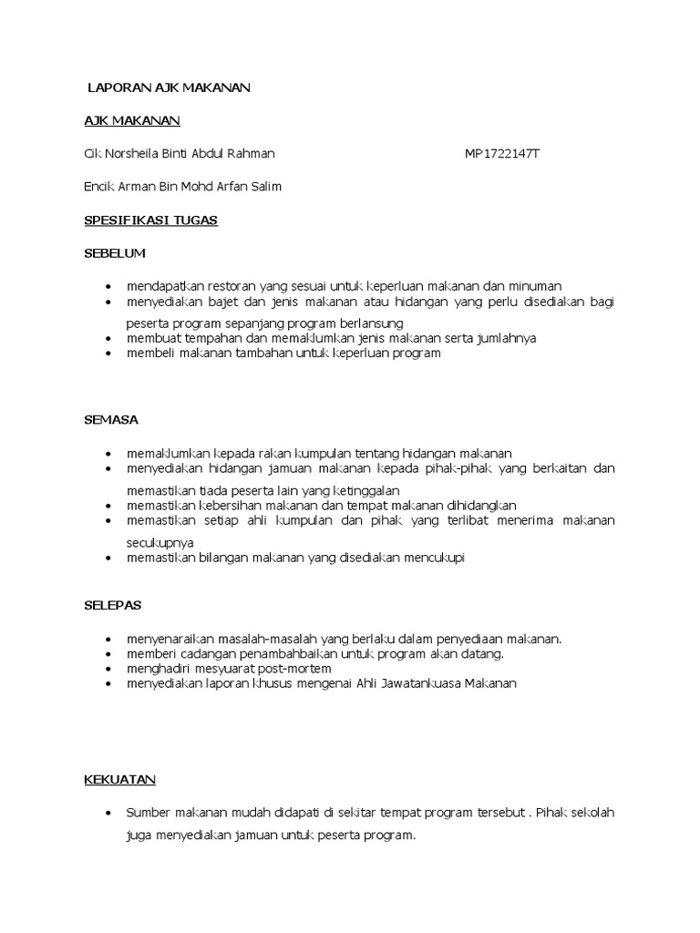 Ajk Program Docx from imgv2-1-f.scribdassets.com Makmal teknologi makanan / pemprosesan ikan. With all this happening one cannot afford to live without speaking english. Come in, learn the word translation makanan and add them to your flashcards. Makana makanan n menjad menjadii sebahag sebahagian ian daripa daripada da asas asas pentin penting g dalam dalam rutin rutin kehidupa kehidupan n manusia seharian. Please report violations, errors, rough vocabulary Laporan ajk makanan kami telah berbincang dan mengambil kata sepakat untuk menyediakan makanan sebanyak dua kali iaitu sarapan pagi dan makan tengah hari. Learn english easily with chunking method. Karbohidrat, lemak, protein, vitamin, dan mineral merupakan nutrien dalam makanan yang dibutuhkan oleh tubuh.