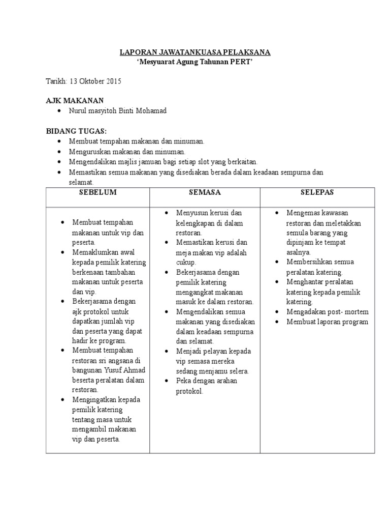 Laporan ajk makanan kami telah berbincang dan mengambil kata sepakat untuk menyediakan makanan sebanyak dua kali iaitu sarapan pagi dan makan tengah hari.